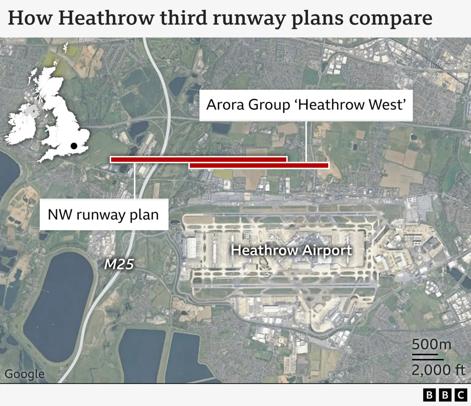 Власники аеропорту хочуть побудувати повноцінну злітно-посадкову смугу довжиною 3500 м (2,2 милі), що передбачатиме перенаправлення автомагістралі M25, тоді як Arora Group шукає дозволу на злітно-посадкову смугу довжиною 2800 м, що усуне необхідність перенесення автомагістралі.