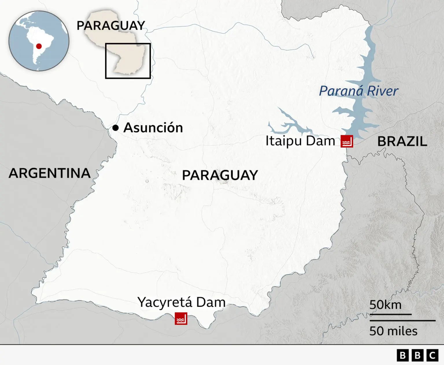 Карта, на якій показано розташування двох головних гідроелектростанцій Парагваю